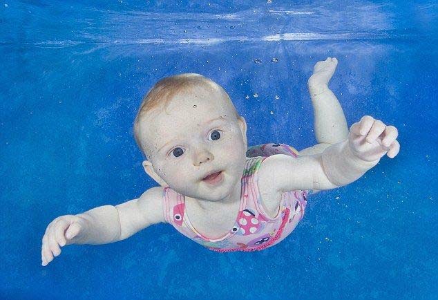 But it's a different story for babies. They have a gag reflex, and being submerged reminds them of being in the womb, meaning when they go under water they look utterly at peace.